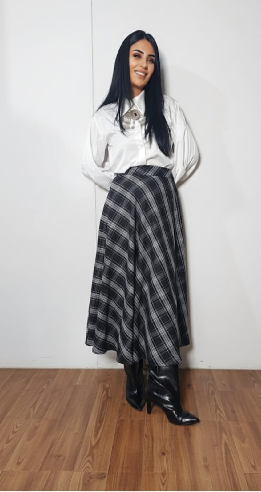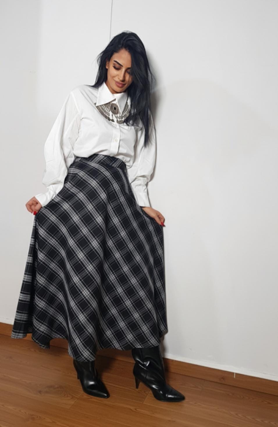 Yüksek bel ekose uzun etek ile zamansız şıklık ve konfor bir arada.Eteğimizin boyu 95 cm dir.